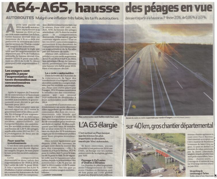 A64-A65, hausse des péages en vue Archives 2 décembre 2015 Lecture : 1 min. Partager : Autoroutes. Malgré une inflation très faible, les tarifs autoroutiers devraient repartir à la hausse au 1er février 2016, de 0,86 % à 1,63 %. Nos autoroutes sont belles mais leur coût devient de moins en moins supportable pour nombre d’usagers. Notre combat vous intéresse ? Inscrivez-vous à notre newsletter pour ne pas rater nos dernières informations et actions. S’abonner Soutenez Activ’Route Grâce à vous, nous pouvons garantir notre indépendance et notre liberté d’action. Je fais un don Précédent Suivant