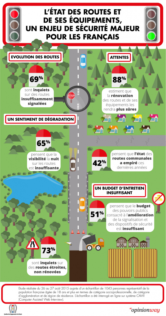 L’Enquête Opinion Way commandée par le SER (Syndicat des Equipements de la route) est éloquente à cet égard. 52 % des Français considèrent que l’état des routes s’est considérablement dégradé depuis quelques années. Il s‘agit des routes empruntées quotidiennement. Concernant l’entretien des équipements de la signalisation verticale (panneau) et horizontale (marquage) ainsi que les dispositifs de retenue routiers (glissières de sécurité) 51 % des Français estiment qu’il est insuffisant.