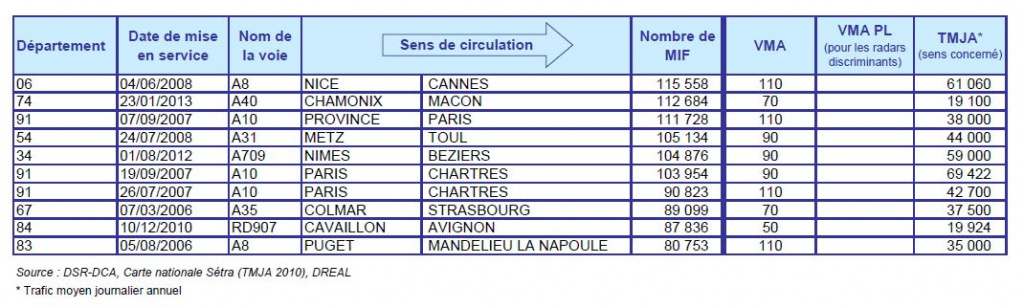 La liste des radars les plus redoutables de France a été dévoilée et les 3 premiers sont de vrais stakhanovistes du flash ! 1 flash toutes les 4 à 5 minutes et cela toute l’année ! Regardez bien ce tableau, où les flashs sont appelés MIF (messages d’infraction) et la vitesse à respecter est désignée par VMA (vitesse maximale autorisée) : c’est à peine croyable ! 6 radars à plus de 100 000 flashs !