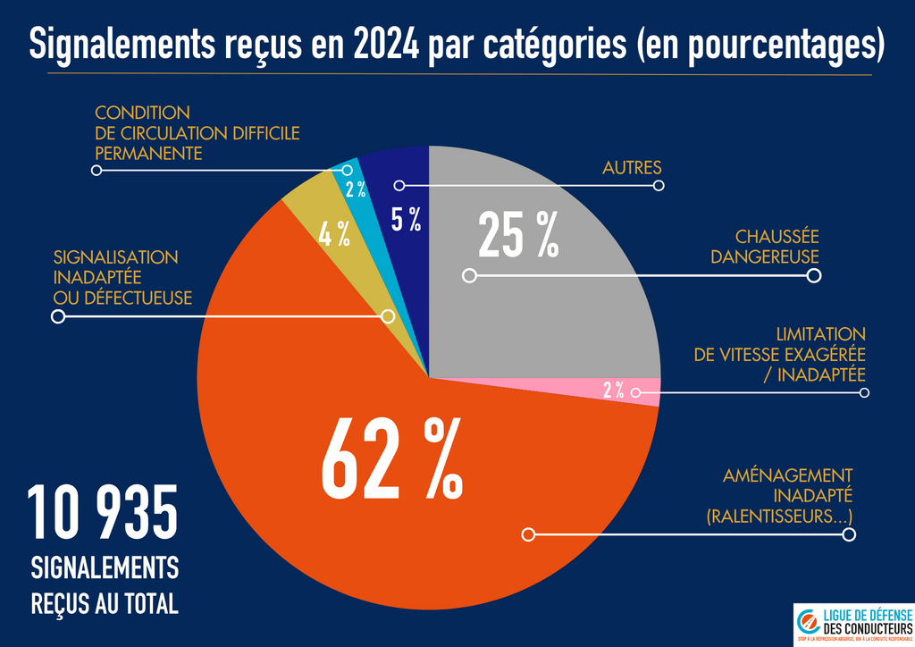 Les 10 935 signalements que nous avons enregistrés en 2024 nous permettent de constater des tendances fortes : 62 % d’entre eux concernent des aménagements inadaptés, avec une forte proportion de ralentisseurs illégaux (6 124 cas). Les problématiques de chaussée dangereuse représentent quant à elles 25 % des signalements, avec une prédominance de cas de nids-de-poule (1 127 cas). Enfin, seuls 4 % des signalements relèvent d’une signalisation inadaptée, en particulier au niveau des intersections dangereuses (228 cas).