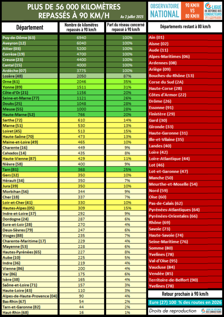 Vous le voyez, le cap des 56 000 kilomètres repassés à 90 km/h est largement franchi. La Ligue de Défense des Conducteurs salue ici les efforts de tous ces départements et encourage ceux qui hésitent encore, tout en amplifiant la mobilisation pour obtenir un véritable retrait du 80 km/h. N’hésitez pas à y inciter vos propres élus, notamment en leur faisant parvenir notre guide juridique pour aider les présidents de département à se décider en faveur du 90, disponible ici.