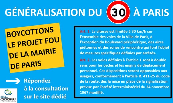 Mais la complication artificielle de la circulation – déjà pénible – dans la capitale ne s’arrête pas là. En effet, Anne Hidalgo entend également généraliser la vitesse plafond de 30 km/h à l’ensemble du territoire parisien dès le début de l’année 2021, c’est-à-dire… dans deux mois. Alors, mobilisez-vous ! Vous pouvez, jusqu’au vendredi 27 novembre à 17h, donner votre avis sur ce programme ubuesque, dont nous publions ci-dessous les deux premiers articles. Pour faire entendre la voix des conducteurs, il suffit de déposer un message sur la page de cette seconde consultation publique :