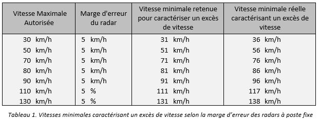 Pour eux, les erreurs maximales tolérées sont de plus ou moins 5 km/h, pour les vitesses mesurées inférieures à 100 km/h et de plus ou moins 5 % de la vitesse mesurée, pour celles qui sont égales ou supérieures à 100 km/h. Les radars fixes installés le long des routes (classiques, double sens, tourelles mais aussi autonomes) sont notamment concernés. Pour ces radars à poste fixe, la marge d’erreur est fixée à + 5 km/h ou + 5 % de la vitesse réelle du véhicule et est retranchée systématiquement de la vitesse mesurée pour établir la vitesse retenue. Ainsi, sur une portion de route comportant une VMA de 80 km/h, un conducteur commettra une infraction à la vitesse lorsque son véhicule sera réellement mesuré, par un radar à poste fixe, avec une vitesse de 86 km/h, ce qui correspondra à une vitesse retenue (en retranchant la marge d’erreur) de 81 km/h (voir tableau 1).
