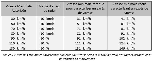 Pour eux, les erreurs maximales tolérées sont de plus ou moins 10 km/h, pour les vitesses mesurées inférieures à 100 km/h et de plus ou moins 10 % de la vitesse mesurée, pour celles égales ou supérieures à 100 km/h. Les dispositifs installés dans les voitures-radars circulant sur les routes (conduites par les forces de l’ordre ou des chauffeurs privés) sont concernés. Pour ces radars installés dans un véhicule en mouvement, la marge d’erreur est fixée à + 10 km/h ou + 10 % de la vitesse réelle du véhicule et est retranchée systématiquement de la vitesse mesurée pour établir la vitesse retenue. Ainsi, sur une portion de route comportant une VMA de 80 km/h, un conducteur commettra une infraction à la vitesse lorsque son véhicule sera réellement mesuré, par un système installé dans un véhicule en mouvement, avec une vitesse de 91 km/h, ce qui correspondra à une vitesse retenue (en retranchant la marge d’erreur) de 81 km/h (voir tableau 2).