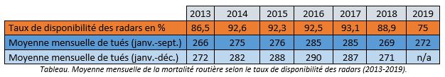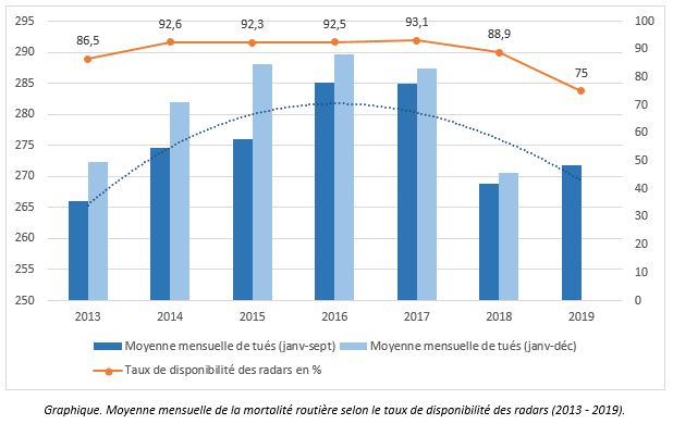 Le taux de disponibilité des radars désigne le rapport entre le nombre d’équipements disponibles et le nombre d’équipements en service au total. Des données de l’Observatoire national interministériel de la sécurité routière (tableau ci-dessous) permettent de constater que les années qui possèdent les taux de disponibilité des radars les plus bas correspondent à celles qui ont la mortalité routière la plus basse (cf. graphique).