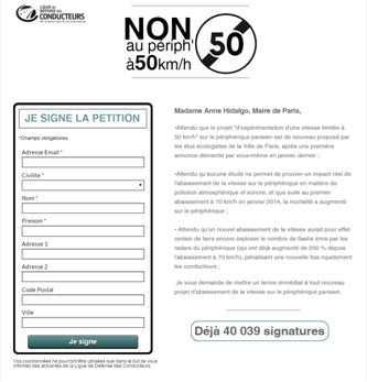 Preuve qu’en se mobilisant, il est possible d’empêcher ce genre de projet : grâce à la réactivité de nos membres franciliens, la Ligue de Défense des Conducteurs a pu s’opposer à temps au ridicule projet d’abaissement de la vitesse à 50 km/h sur le périphérique parisien. A deux reprises, entre janvier et mars derniers, nous avons ainsi fait barrage aux élus écologistes de la capitale, porteurs de ce projet absurde, avec notre pétition « Non au périph à 50 km/h » et nos alertes adressées à la Maire de Paris, qui nous a confirmé dans un courrier qu’un nouvel abaissement de la vitesse sur le périph n’était pas à l’ordre du jour.